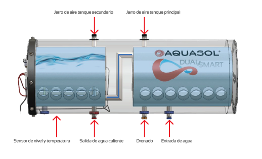 Desarrollado por el equipo de ingeniería de AQUASOL y probado en nuestros laboratorios, el calentador solar DualSmart representa una nueva generación en soluciones termosolares. Es un sistema híbrido inteligente que combina el aprovechamiento de la energía solar con un respaldo eléctrico de alta eficiencia, controlado mediante conexión Wi-Fi desde la AQUA App. Gracias a su diseño patentado de doble tanque interno y a su funcionamiento por gravedad, garantiza agua caliente disponible en todo momento, optimizando el consumo energético y ofreciendo máximo confort al usuario.